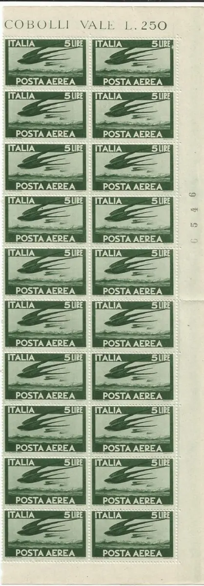 MNH Vollgummi - Luftpost Lire 5 Democraatica Nr. 129 Block von zwanzig a. von f. mit Wasserzeichen in CD-Position + komplette Briefe 10/10 links auf 10 Exemplaren - Gebraucht Cod. 649/7