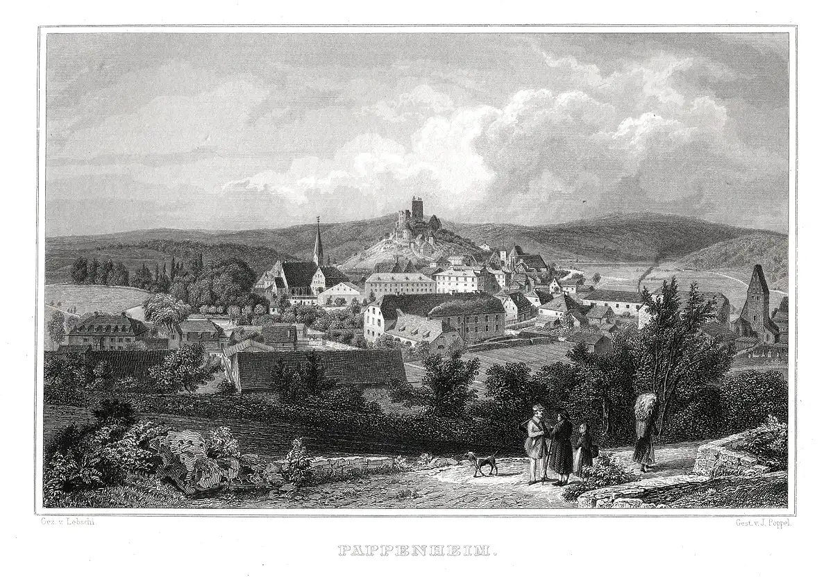 PAPPENHEIM - Gesamtansicht mit Burg.. Echter Stahlstich um 1850