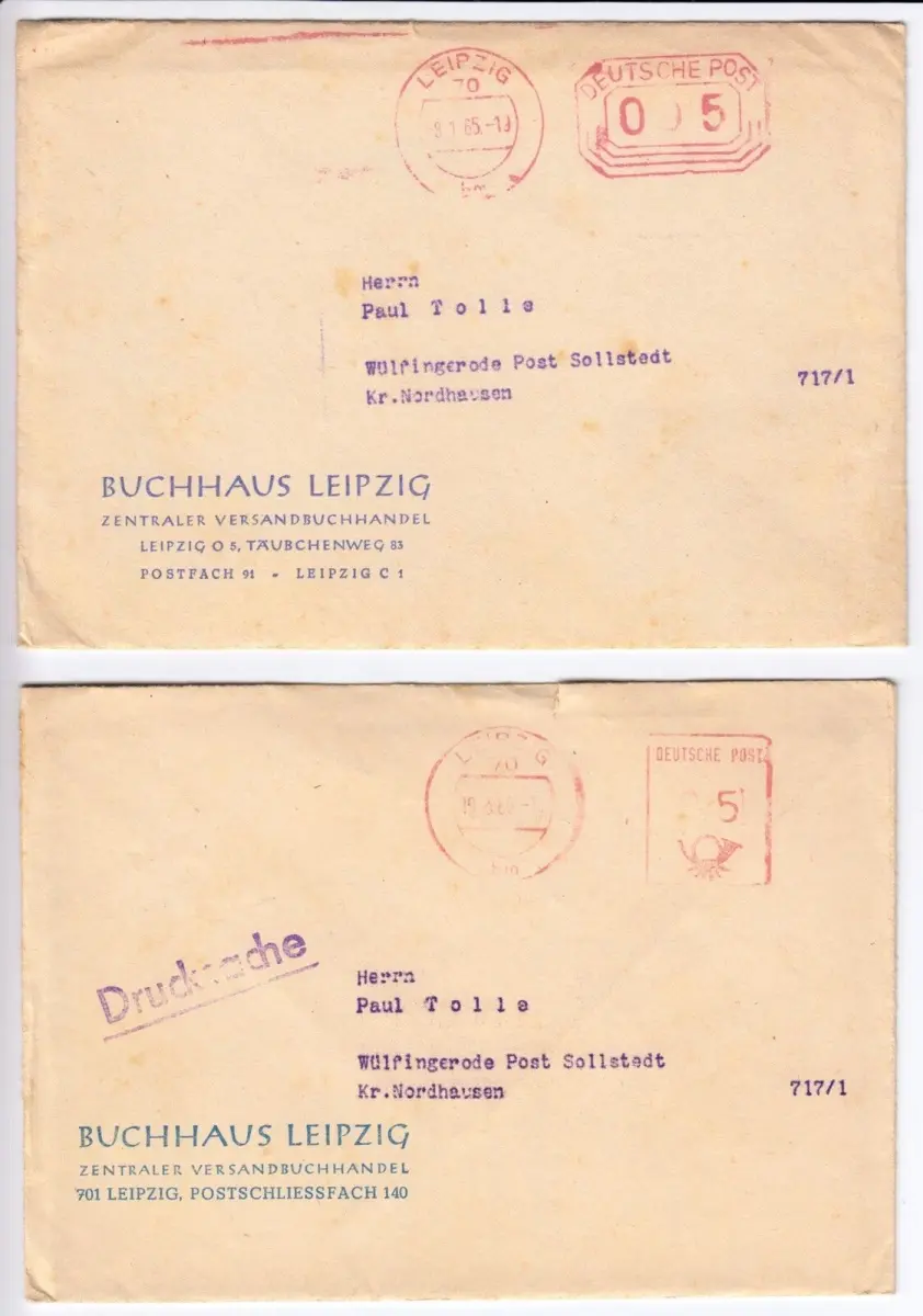 Abbildungen: keine Absender: Buchhaus Leipzig, Zentraler Versandbuchhandel, Leipzig O 5, Täubchenweg 83 Empfänger: Pau Tolle, Wülfingerode Post Sollstedt, Kr. NordhausenPorto: 005 bzw. 05 Nebenstempel: Drucksache Anmerkungen: leichte Beförderungsspuren inneliegende Dokumente: Buchangebote Format: 21 x 29,7 cm Seiten: je 2 Der