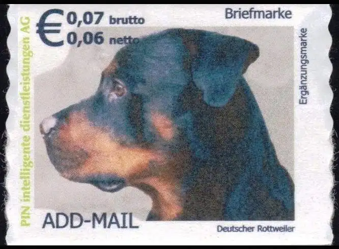 • MichSeite PIN AG: MiNr. 25 y, 01.11.2003, "ADD-Mail - Deutscher Rottweiler", postfrisch Beschreibung \nAusgabeland: Bundesrepublik Deutschland \nPostdienstleister: PIN AG, Berlin \nAusgabeanlass: Briefmarkenausgabe "ADD-Mail: Deutscher Rottweiler" Katalognummer: MiNr. 25 y Ausgabedatum: 01.11.2003 Nominale: Satz (1 Wert) zu 0,07 EUR \nTyp: weißes Papier (1. Auflage) \nErhaltung: selbstklebend, wellenartig und gerade gestanzt, postfrisch \nHinweis: auch in gößeren Einheiten erhältlich Thema: Hund, Hunderasse