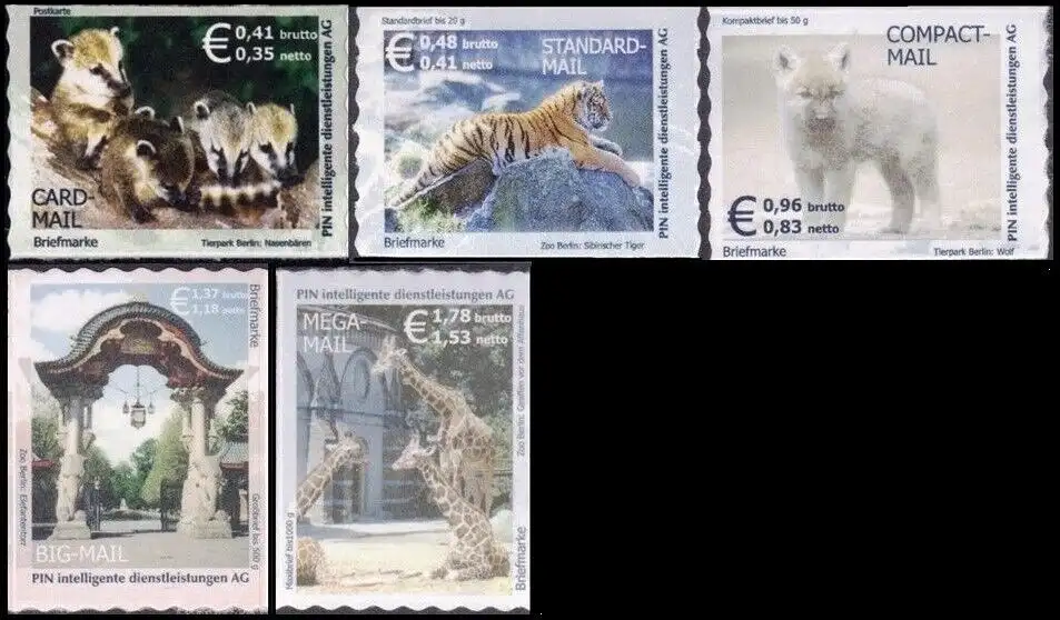 • MichSeite PIN AG: MiNr. 26 - 30, 14.11.2003, "Zoo und Tierpark, Berlin", Satz, postfrisch Beschreibung \nPostdienstleister: PIN AG, Berlin \nAusgabeanlass: Briefmarkenausgabe "Zoo und Tierpark, Berlin: : Nasenbär, sibirischer Tiger, junger Wolf, Elefantentor, Giraffen" Katalognummer: MiNr. 26 y, 27 II, 28 y, 29 y, 30 y Ausgabedatum: 14.11.2023, 00.02.2004 Nominale: Satz (5 Werte) zu 0,41 EUR, 0,48 EUR, 0.96 EUR, 1,37 EUR, 1,78 EUR, \nTyp: MiNr. 26, 28, 29, 30: weißes Papier (1. Auflage),