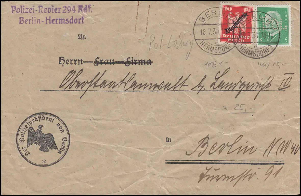 POL-Lochung B 13 auf 411 mit Dienstmarke MiF Orts-Brief BERLIN-HERMSDORF 18.7.30