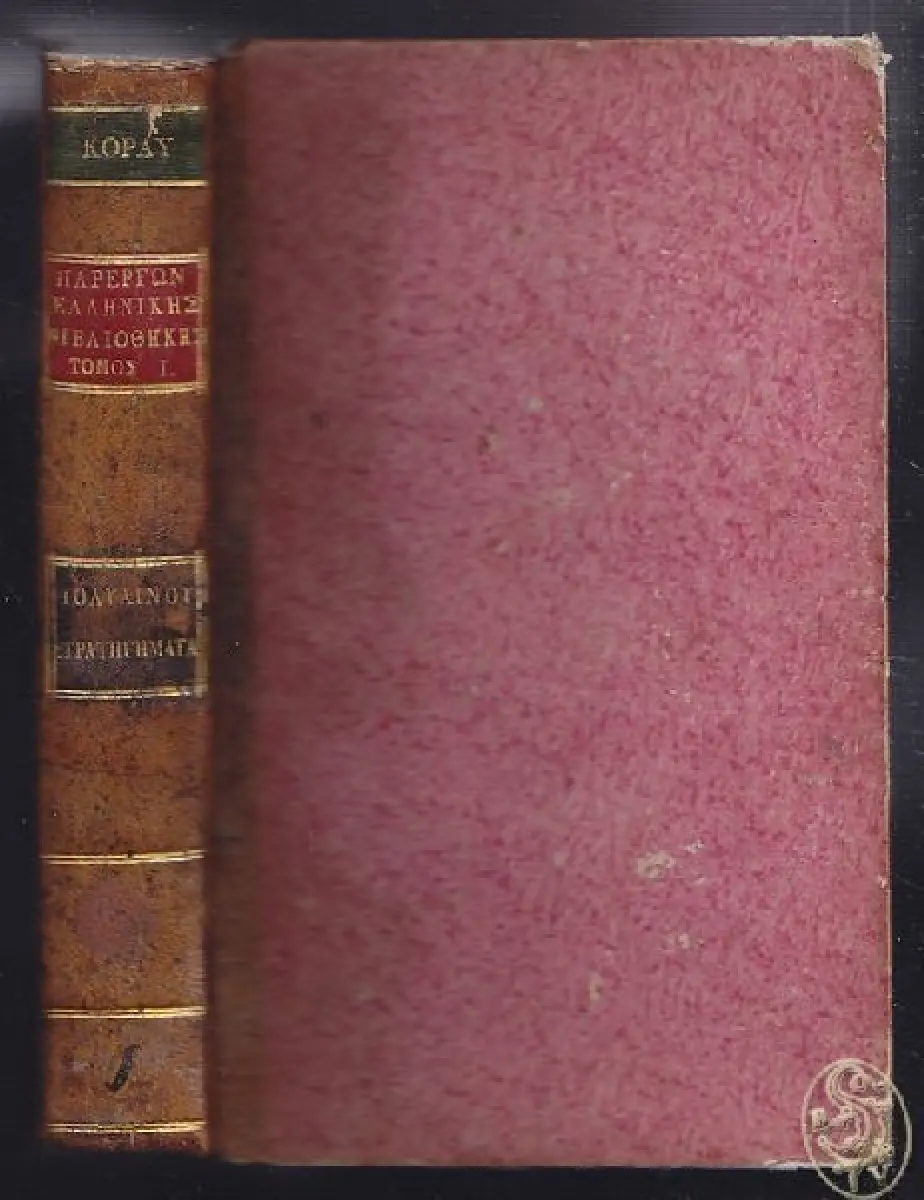 Paris, Typographias I. M. Eberartos [1809]. 8°. 6 Bll., 433 (1) S. HLdr. d. Zt. m. zweifarb. Rückensch. u. Rückengoldpräg. Durchgeh. leicht stockfl. - (Parerton Ellenikes Bibliothekes, Tomos Protos)
