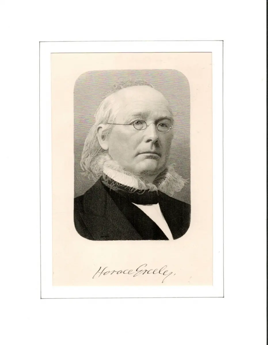 Horace Greely begründete die "New York Daily Tribune", lange die einflußreichste Zeitung des Landes, nachdem er zuvor a. an der Begründung des "New Yorker" beteiligt gewesen war. Politisch war sein Hauptanliegen die Abschaffung der Sklaverei. - Äußerer Blattrand leicht gebräunt