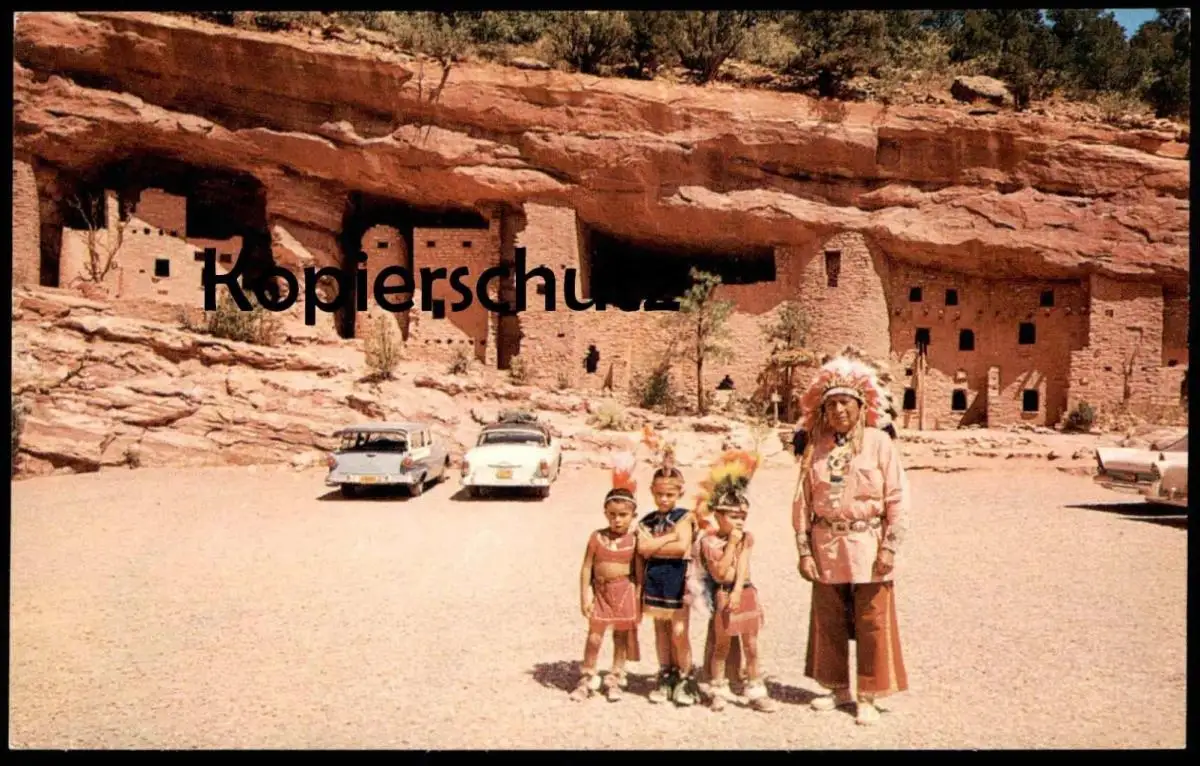 POSTKARTE CLIFF DWELLINGS CHIEF & CHILDREN IN TRIBAL DRESS INDIANS Indianer Indian Indien Kopfschmuck feather headdress