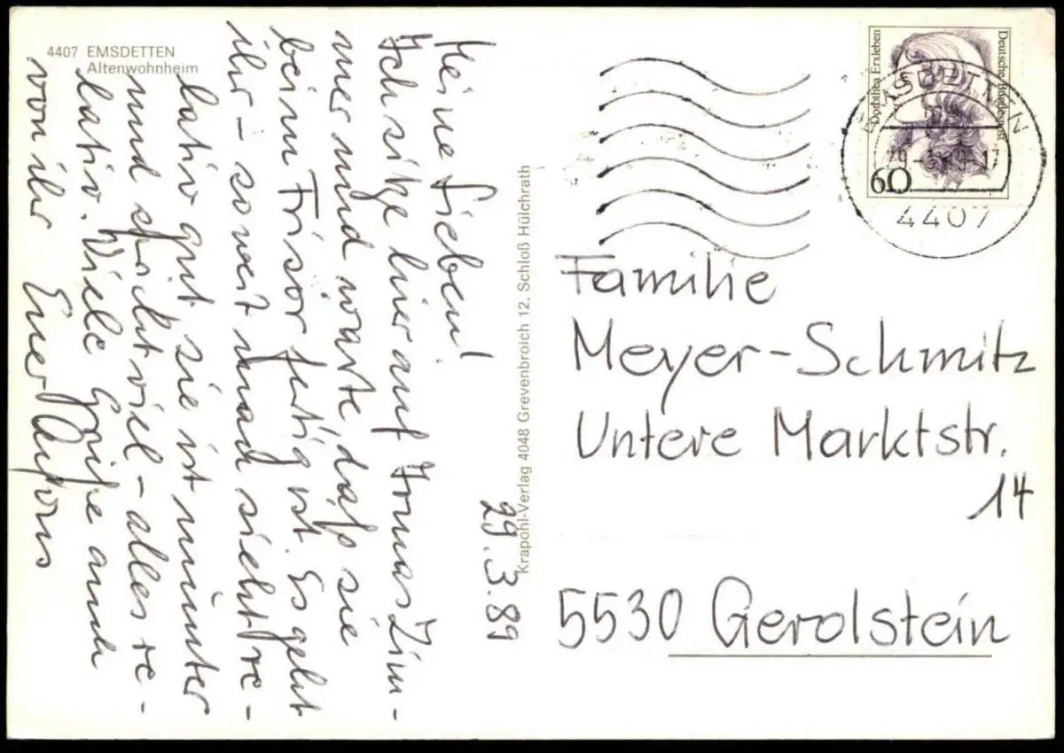 Gelaufen: 29.03.1989 mit Stempel Emsdetten nach Gerolstein