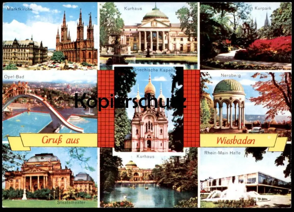 ÄLTERE POSTKARTE GRUSS AUS WIESBADEN GRIECHISCHE KAPELLE MARKTKIRCHE OPEL-BAD KURHAUS KURPARK NEROBERG RHEIN-MAIN-HALLE STAATSTHEATERVerlag: Michel & Co., Frankfurt Main