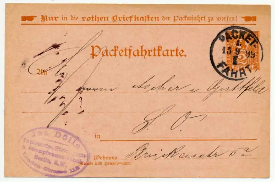 Berliner Packetfahrtkarte / Paketfahrtkarte, gelaufen