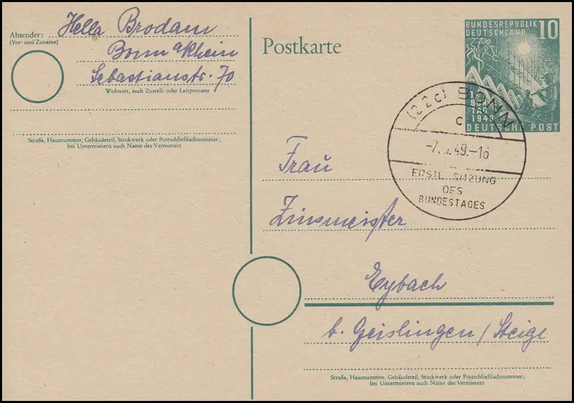 Ersttagskarte mit Ersttagssonderstempel Bonn - Erste Sitzung des Bundestages 7.9.49 nach Eybach / Geislingen (Steige)