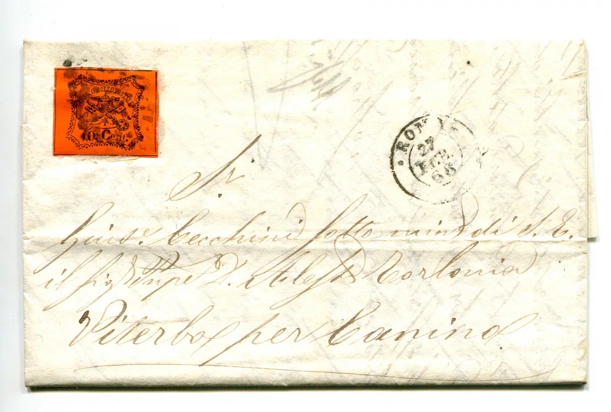 Päpstlich - 10 c. orange Zinnober isoliert auf Brief von Rom nach Vite Busta - Päpstlich - 10 c. orange Zinnober isoliert auf Brief von Rom nach Viterbo am 27.Feb.68 - sehr guter Erhaltungszustand Cod. 3/13