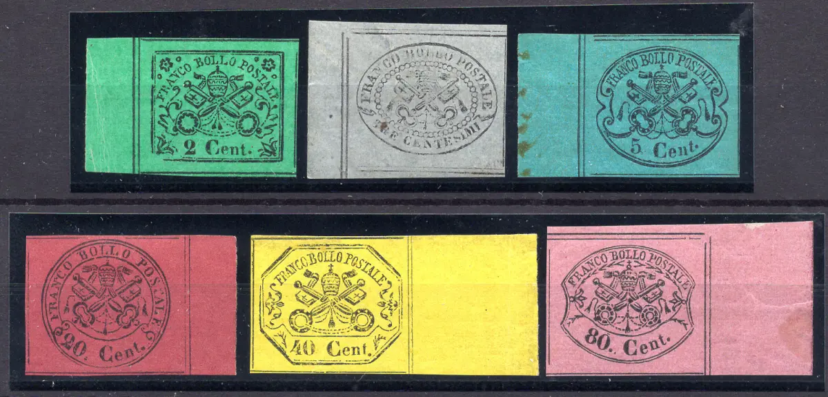 MH - Mit Linguella - - Päpstlich - Zweite Ausgabe Cent. 2, 3, 5, 20, 40 und 80 sechs Werte der Serie alle von sehr guter Qualität, frisch mit breiten Rändern und Bogenrand - Die 3 Cent. grauer Blatteck - Cert. Bolaffi 80% - Gebraucht - Kat. euro 4.850 Cod.8/182