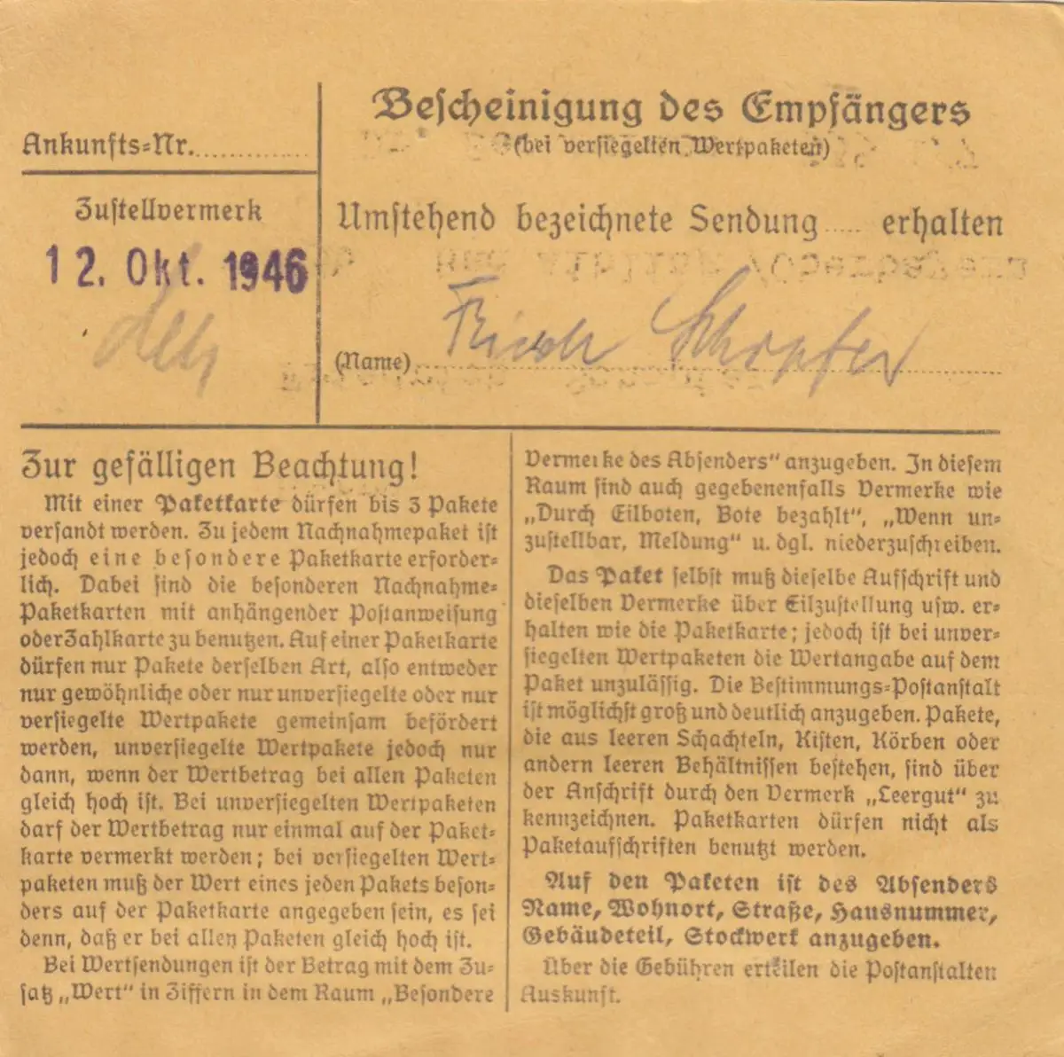 Paketkarte 1946: Pfatter über Regensburg nach Bad Aibling