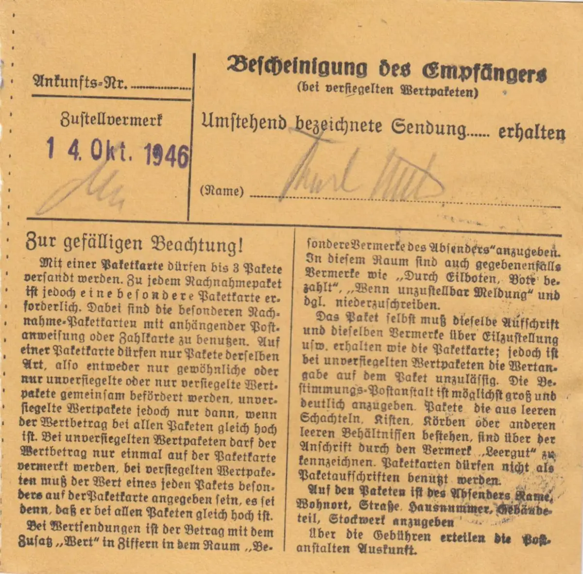 Paketkarte 1946: Weißenburg nach Bad-Aibling, Pak. v Nässe schütz., Tabak