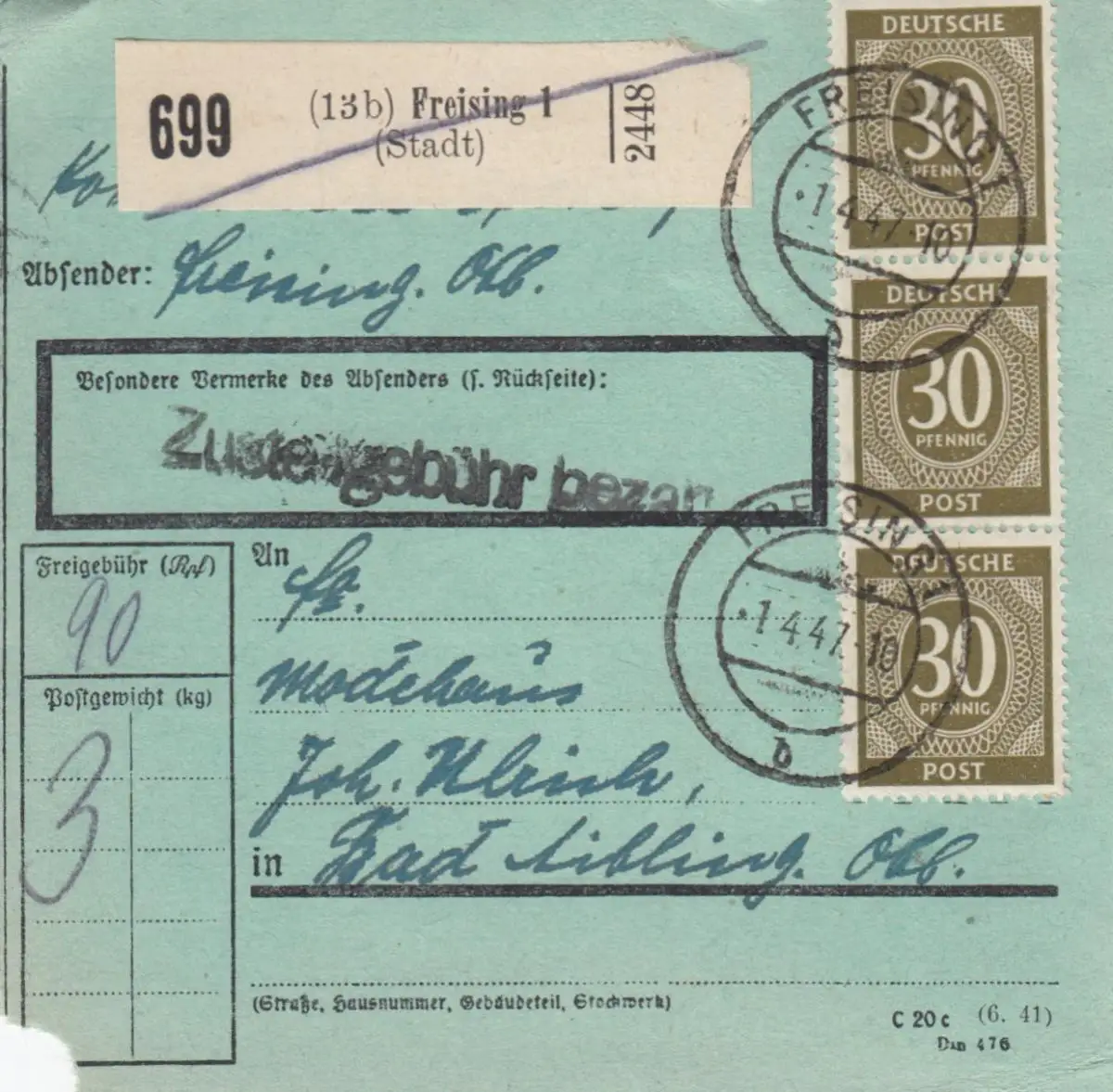 Paketkarte 1947: Freising nach Modehaus Bad Aibling, besonderes Formular