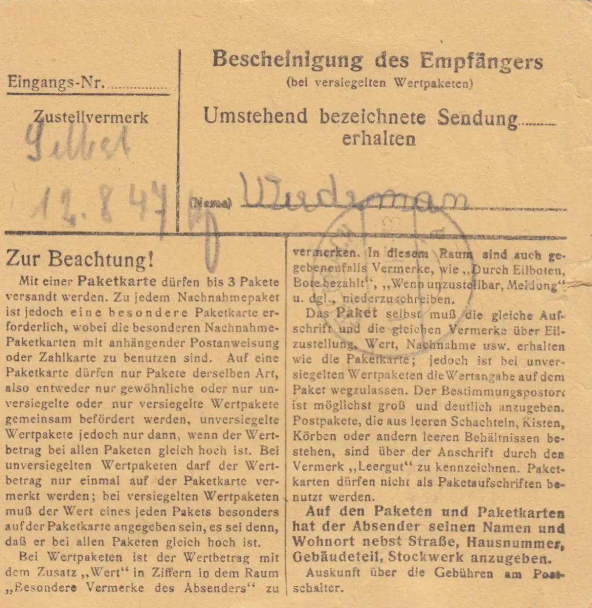 Paketkarte 1947: München nach Feilnbach, Dringend