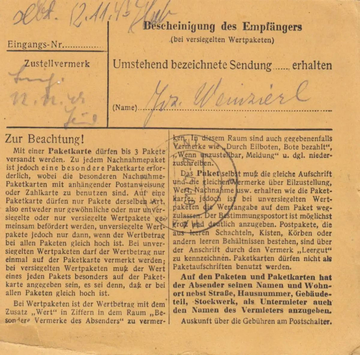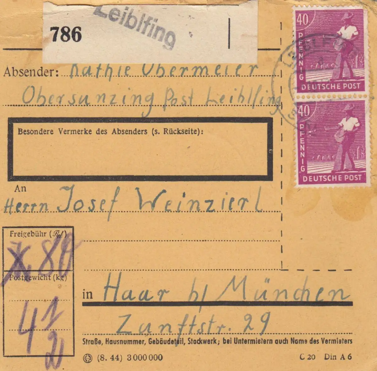 Paketkarte 1947: Obersunzing Leiblfing nach Haar