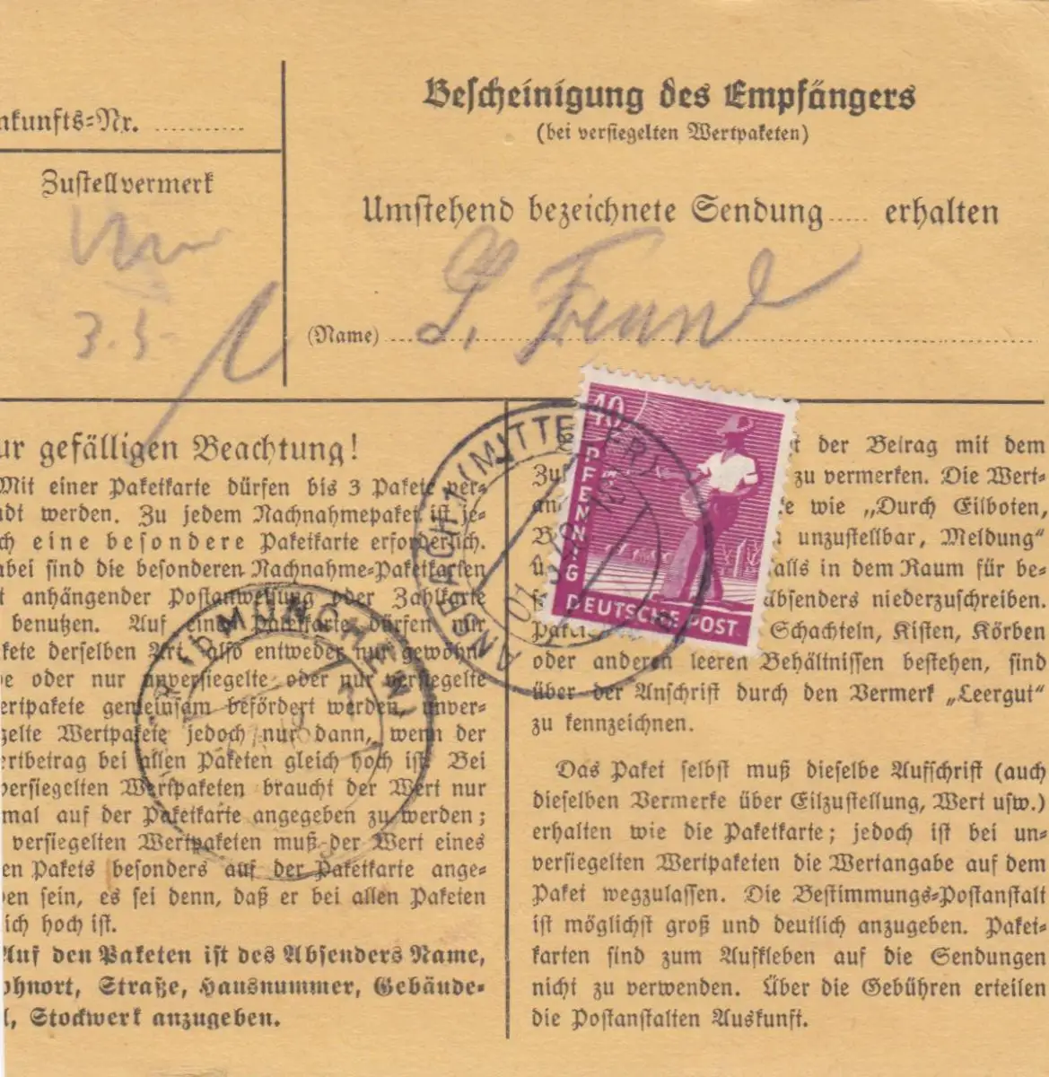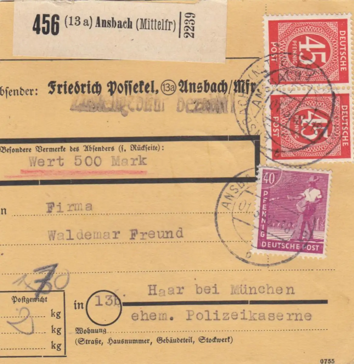 Paketkarte 1948: Ansbach nach Haar, Selbstbucher, Wertkarte