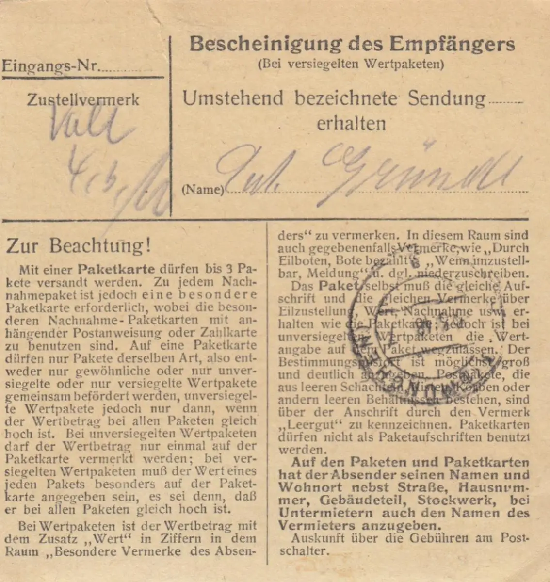 Paketkarte 1948: Frabertsham Pirach nach Anstalt Eglfing