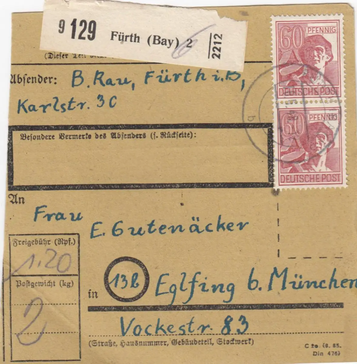 Paketkarte 1948: Fürth nach Eglfing b. München