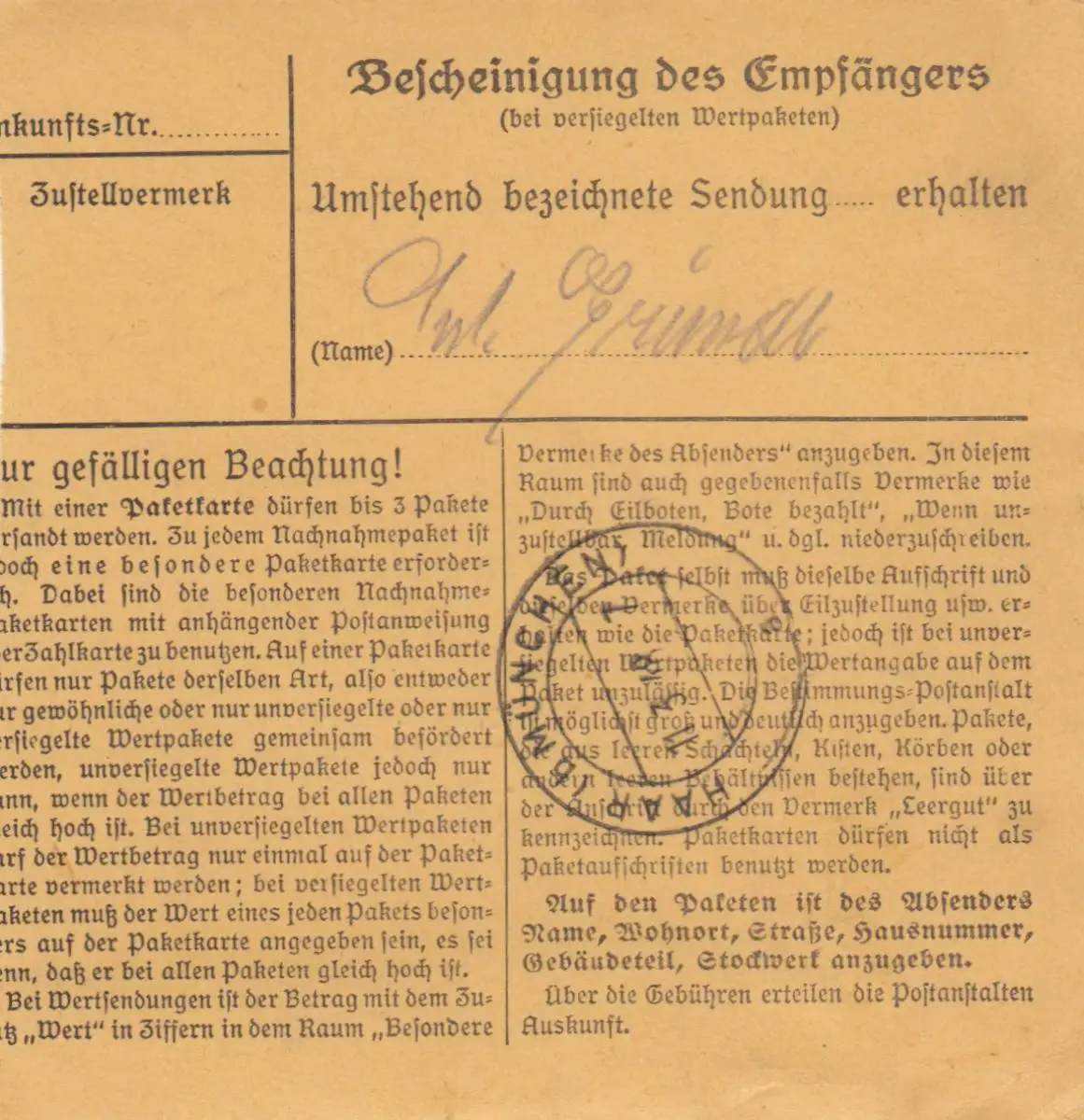 Paketkarte 1948: Gut Irlbach, Straßkirchen, Saatzucht, Selbstbucher