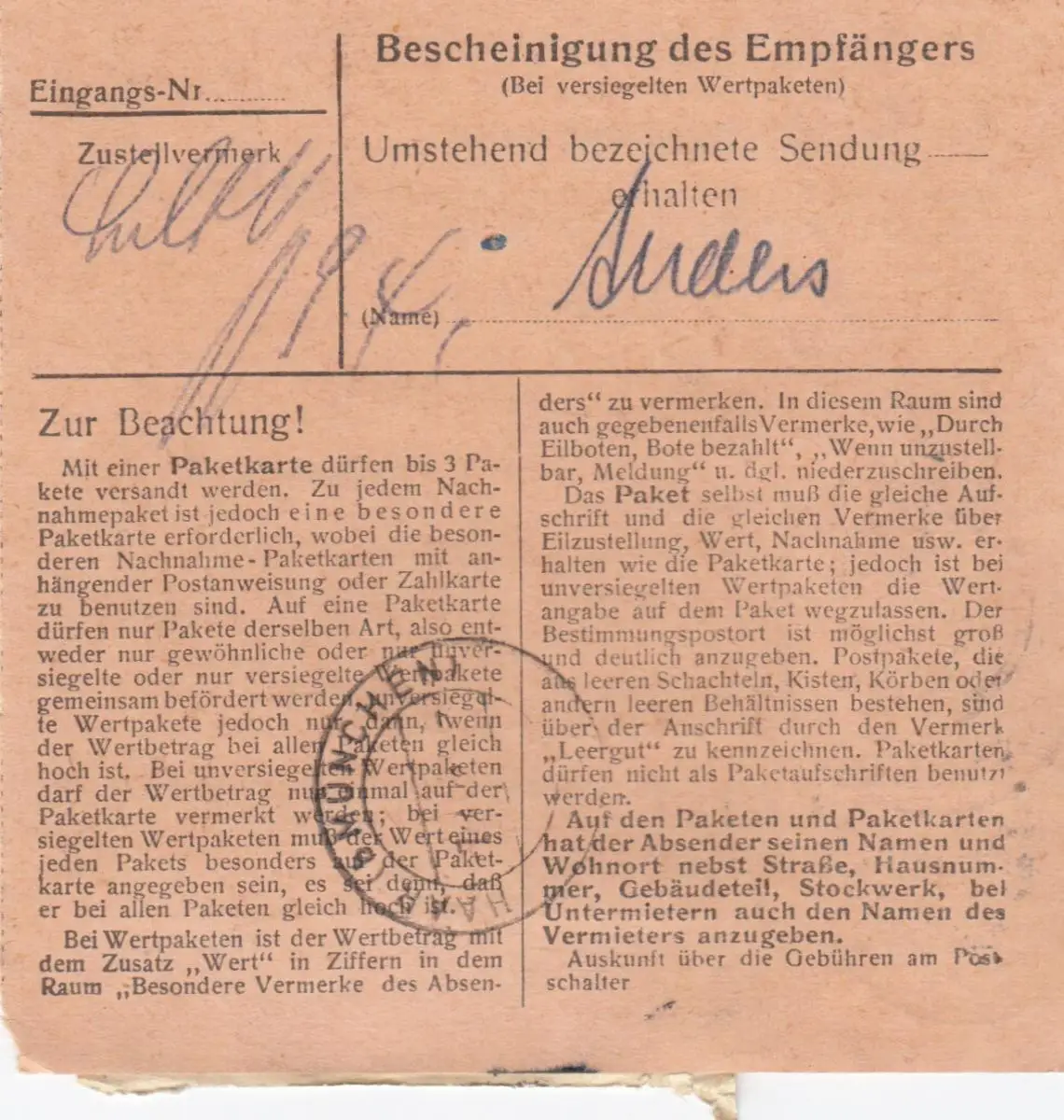 Paketkarte 1948: Mittenwald nach Haar bei München