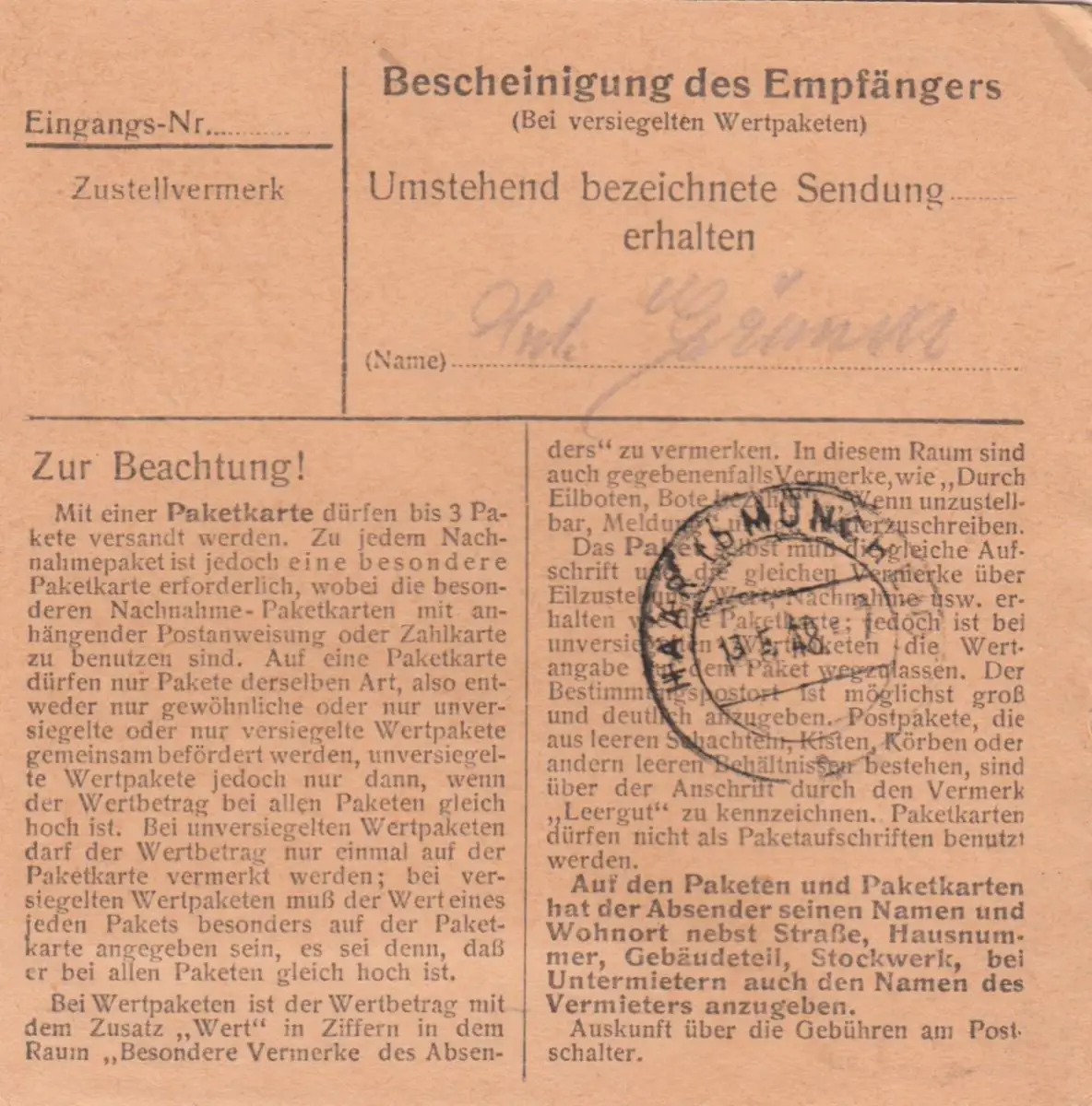 Paketkarte 1948: Moosen Vils nach Haar, Oberpflegerin