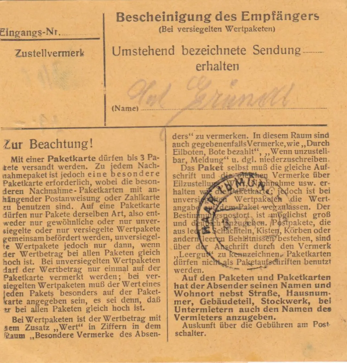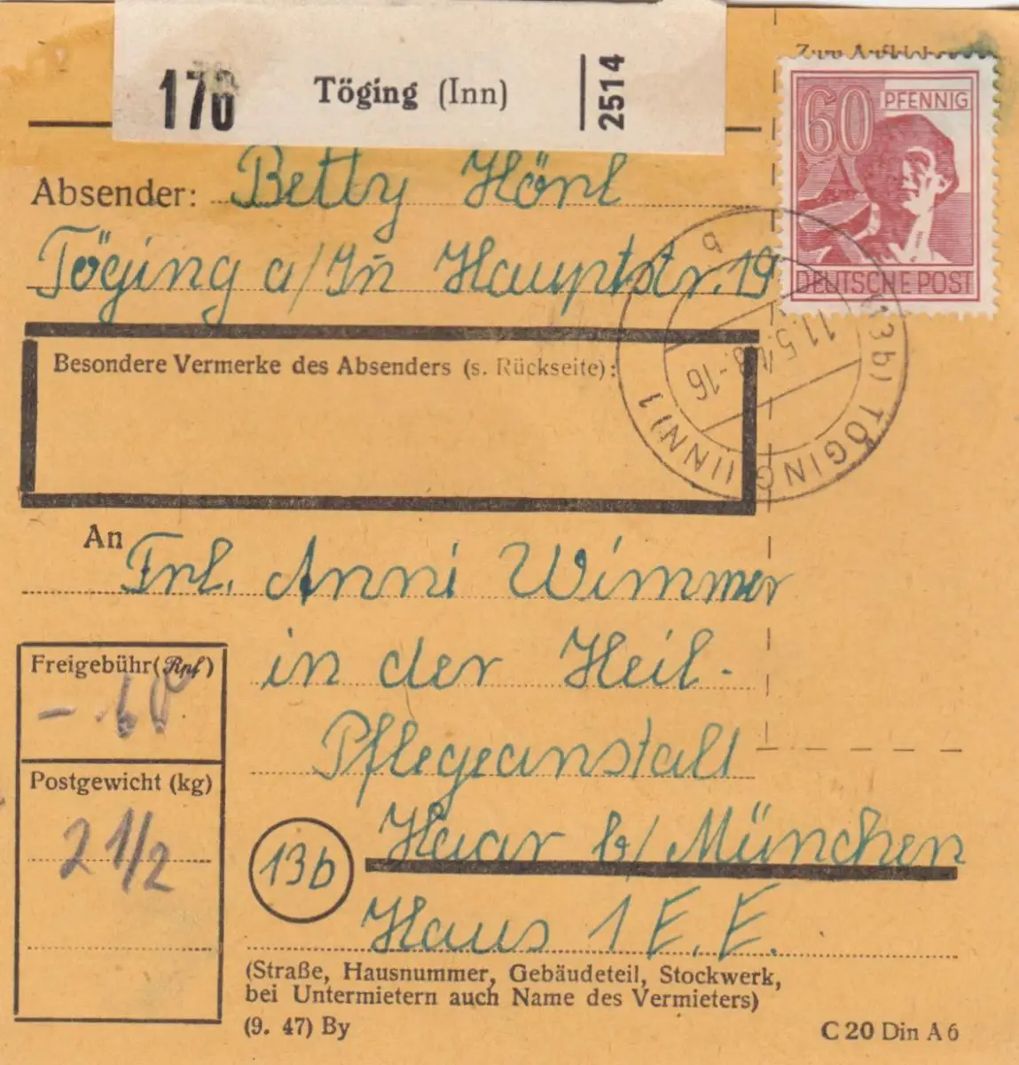Paketkarte 1948: Töging nach Haar, Pflegeanstalt