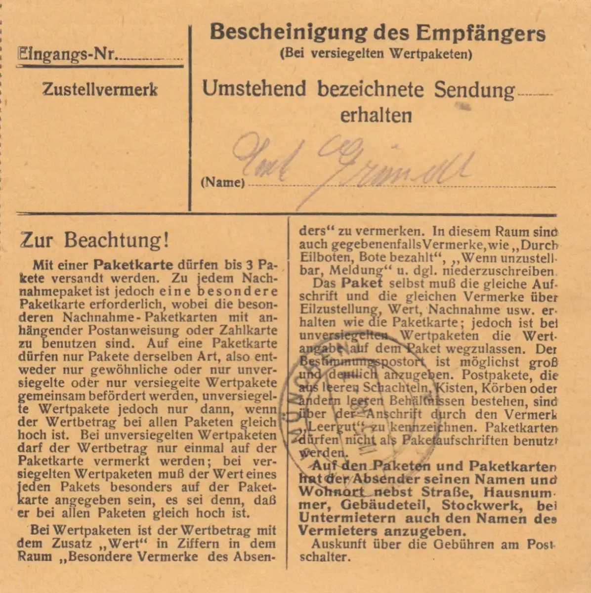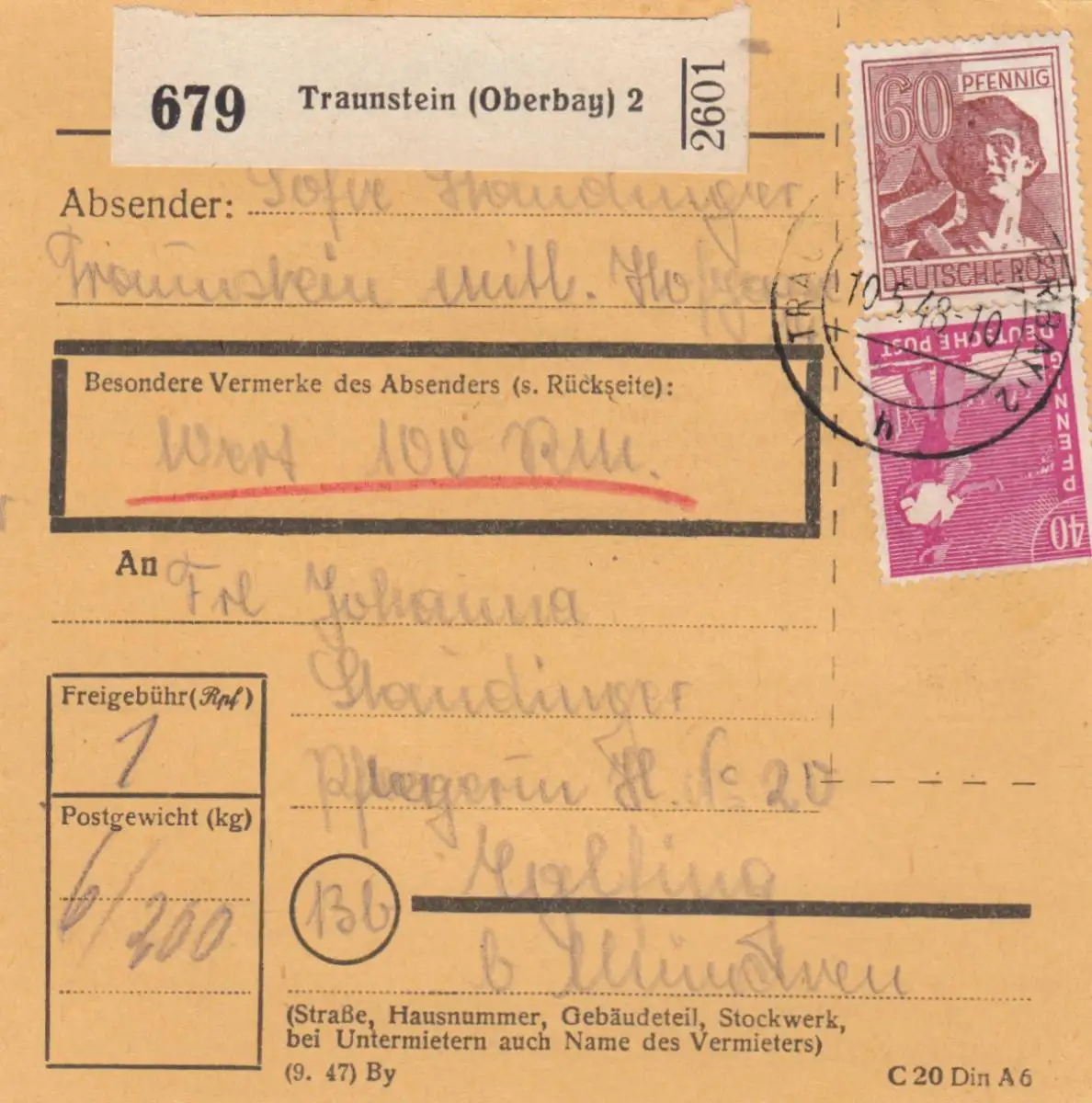 Paketkarte 1948: Traunstein nach Eglfing, Wert 100 RM