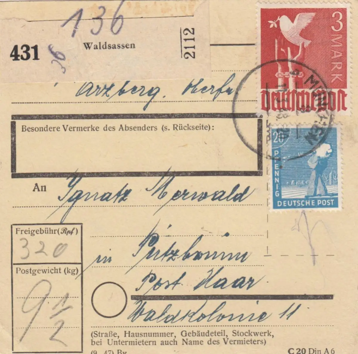 Paketkarte 1948: Waldsassen nach Putzbrunn Post Haar