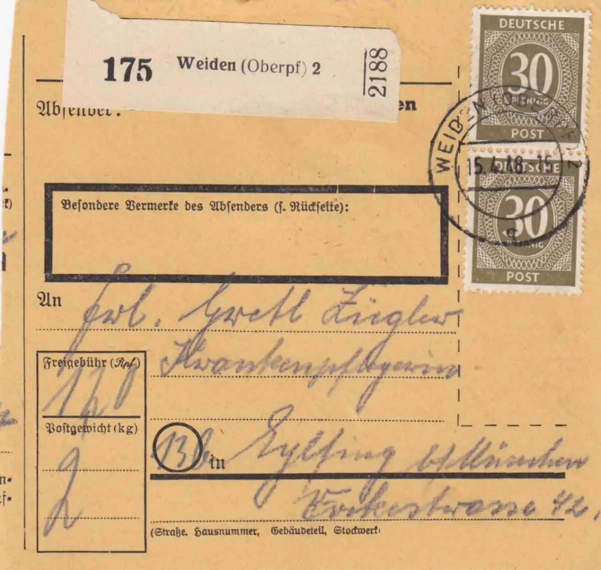 Paketkarte 1948: Weiden nach Eglfing, Krankenpflegerin