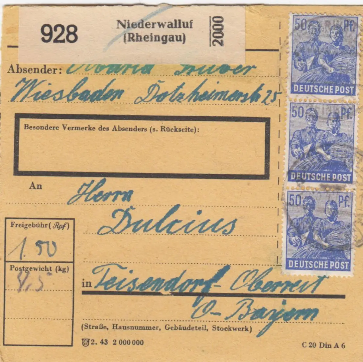 Paketkarte 1948: Wiesbaden Niederwalluf nach Teisendorf