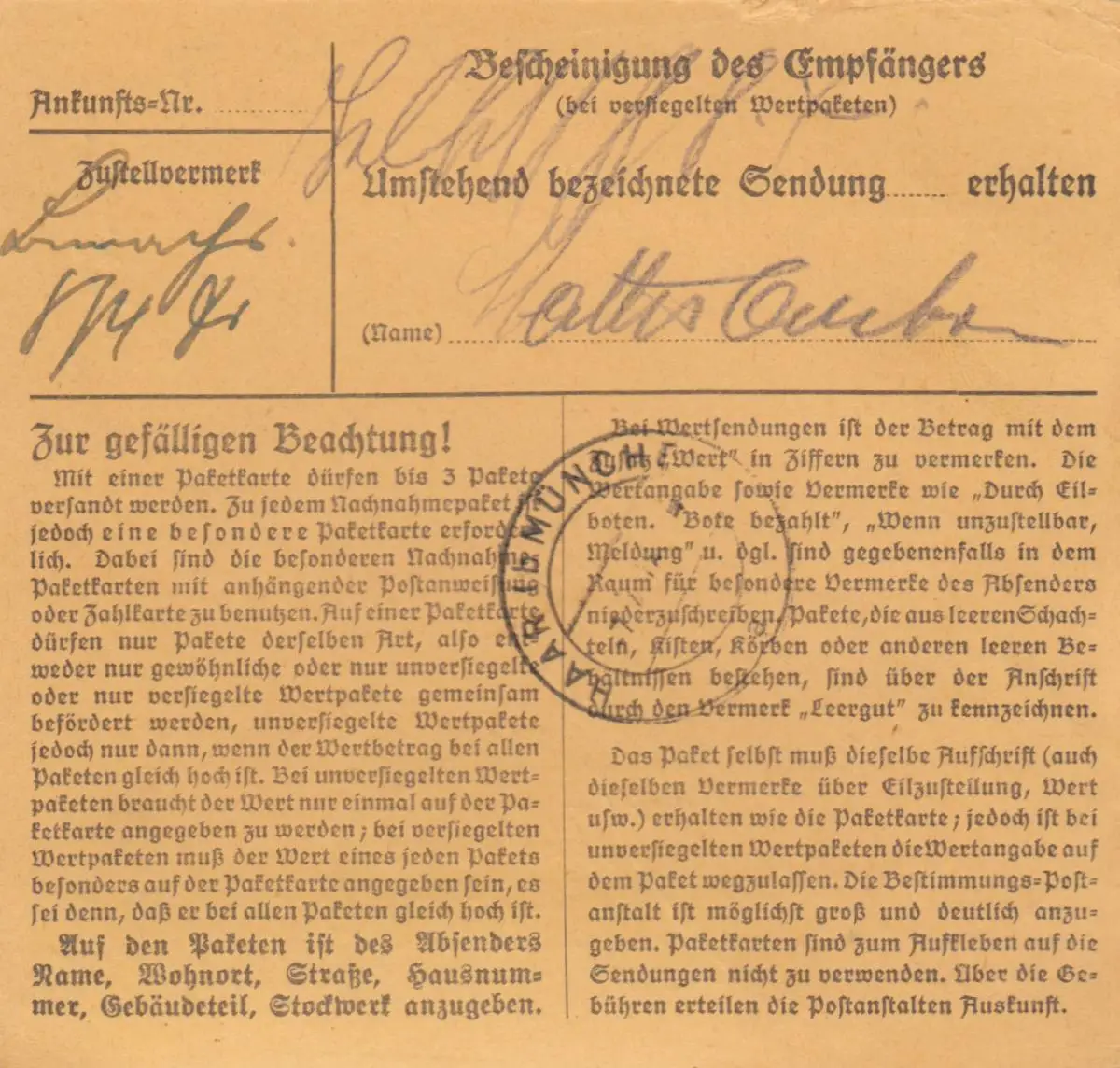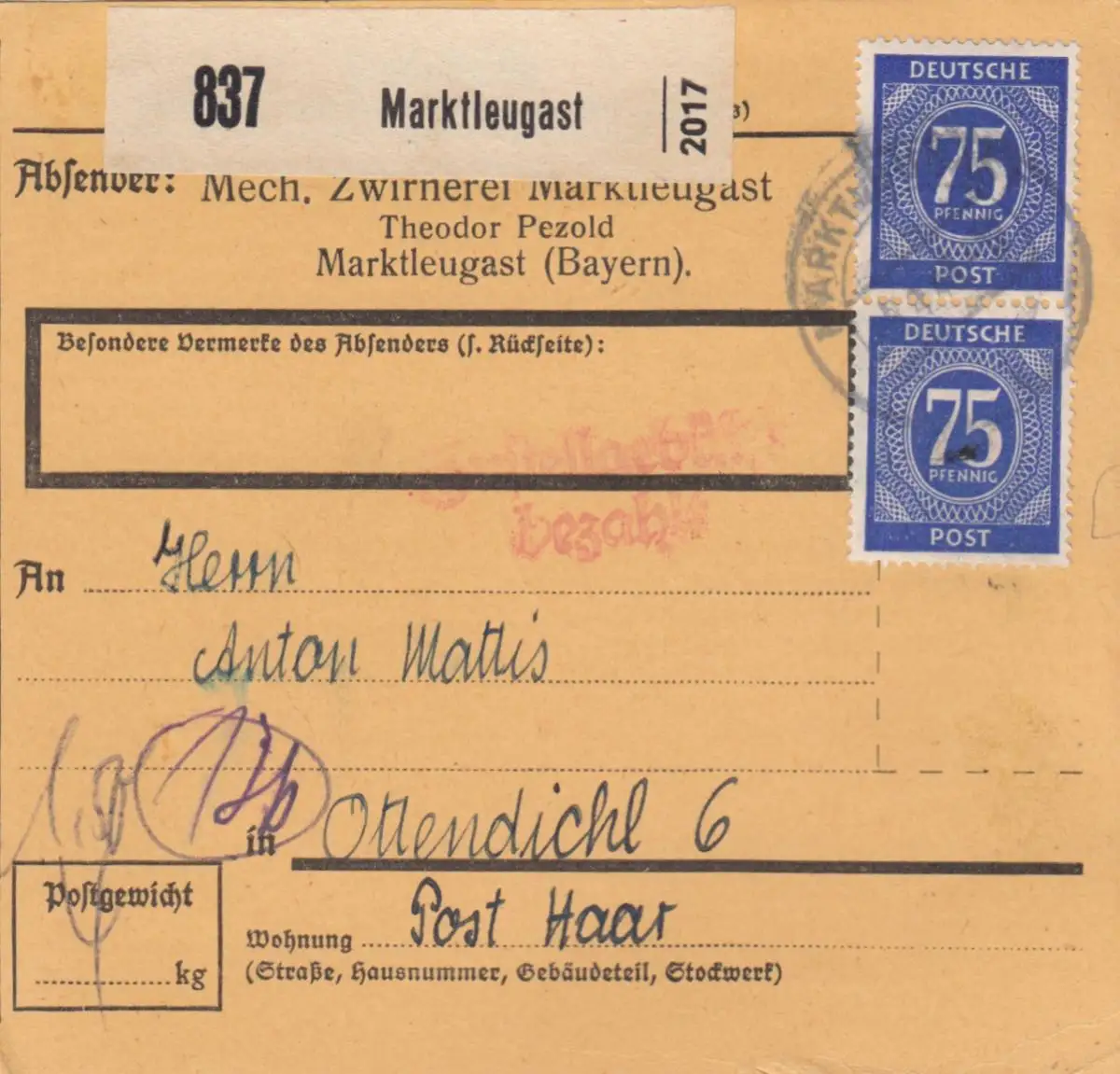 Paketkarte: Marktleugast, Mech. Zwirnerei, nach Ottendichl, Selbstbucher