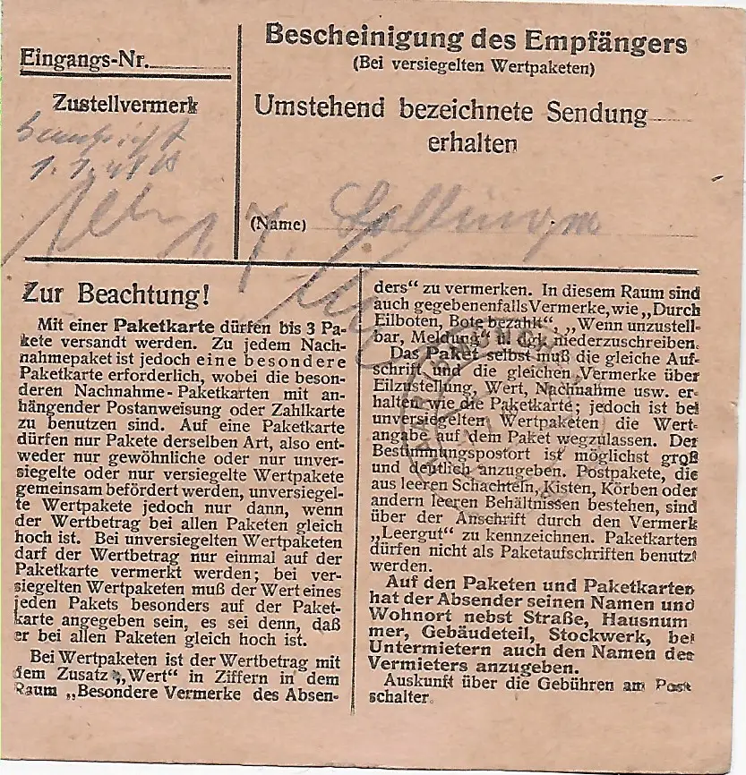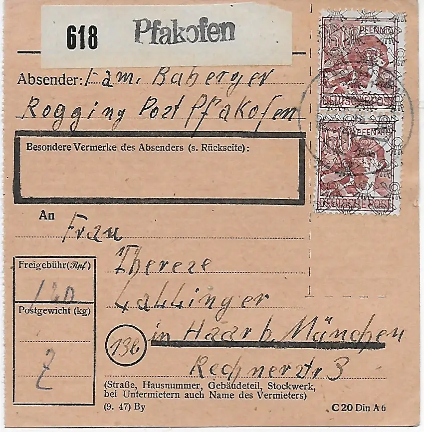 Paketkarte Rogging, Pfakofen nach Haar 1948, A49 II, MeF