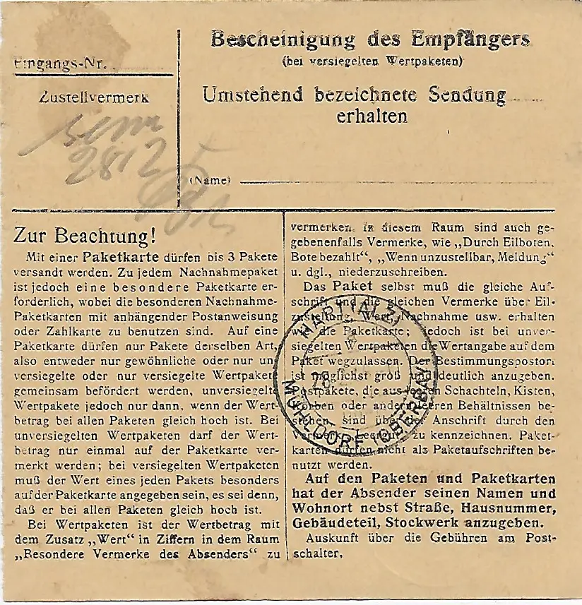 Paketkarte Sachrang nach Hart an der Sulz, 1948, MeF