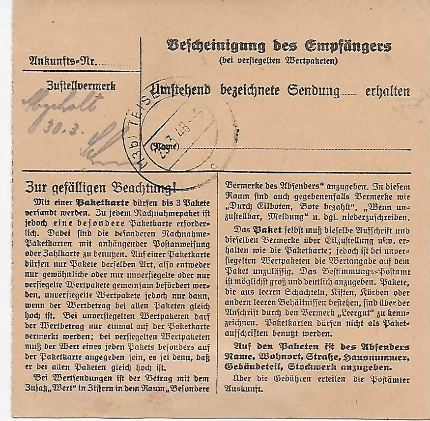 Paketkarte von Stuttgart-Feuerbach nach Teisendorf, 1948, MeF