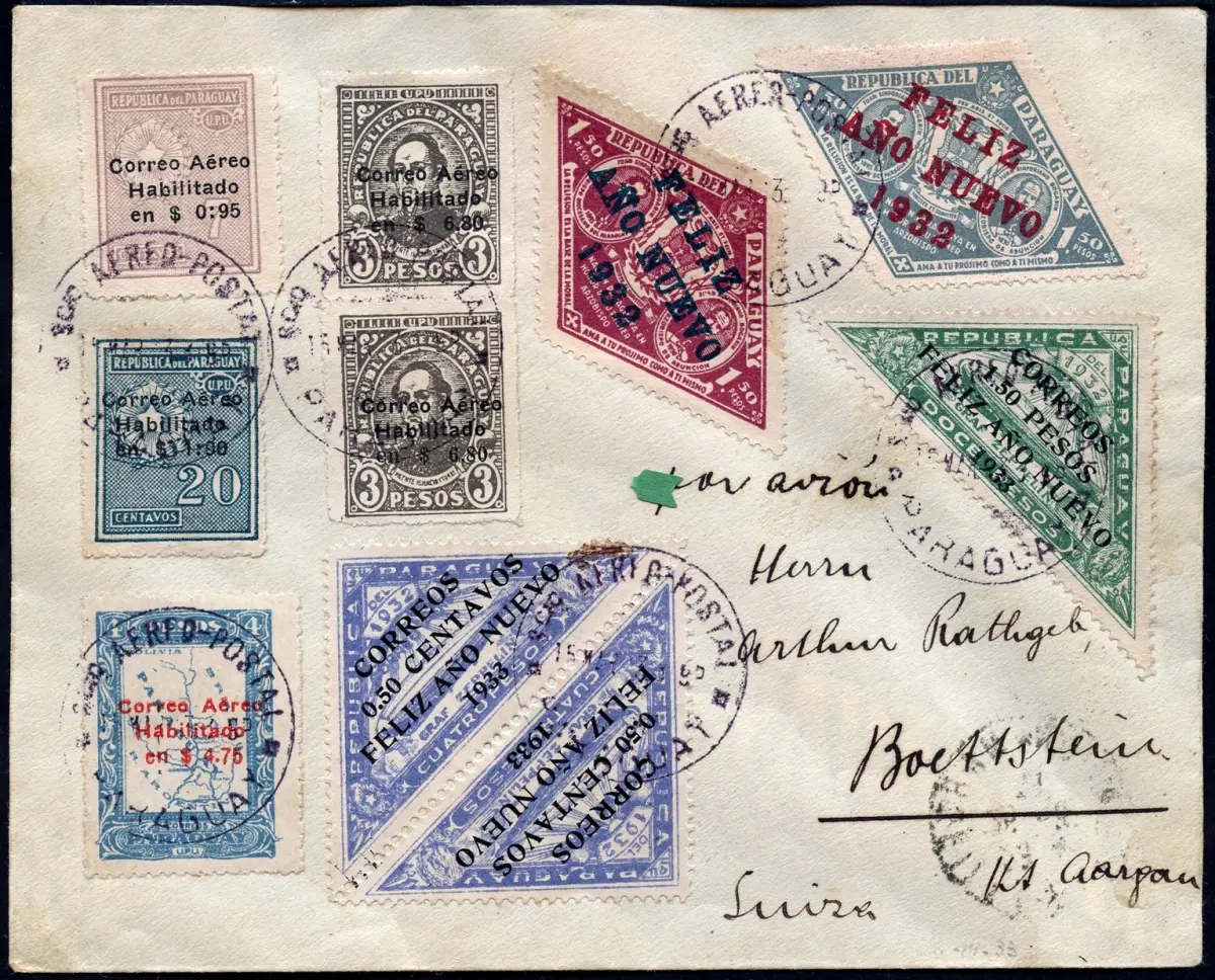 Mischfrankatur (u. a. Zeppelin-Aufdruckmarken Neujahr 1932) aus Asuncion nach Böttstein/Schweiz gelaufen.