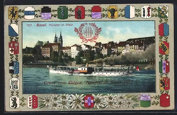 Passepartout-AK Basel, Münster mit Pfalz, Dampfer, versch. Wappen der Kantone