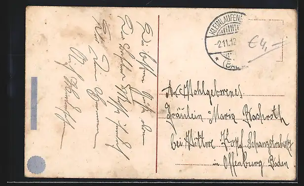alte Ansichtskarte, gelaufen 1912, Briefmarke entfernt, rückseitig Oberflächenschaden, Eckknick li. oben, guter Zustand