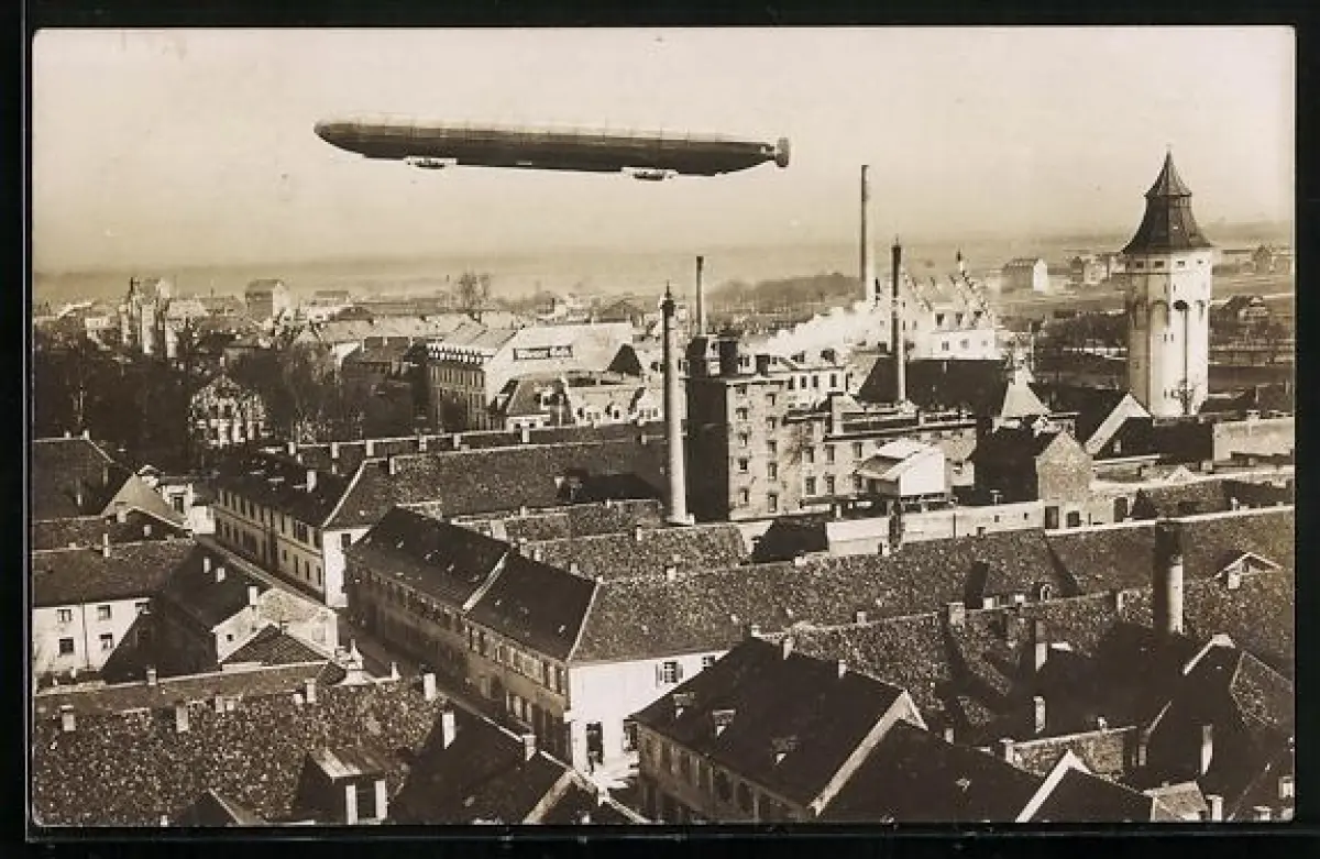 Passepartout-AK Rastatt, Zeppelin über den Dächern der Stadt