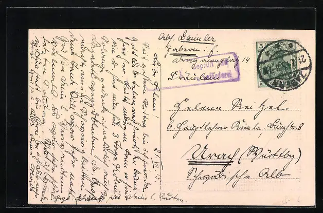 Personenbezogene Daten auf der Rückseite der Karte wurden durch blauen Textmarker unkenntlich gemacht. Die blauen Stellen sind auf die Vorderseite durchgeweicht und wirken sich negativ auf das Postkartenfoto aus