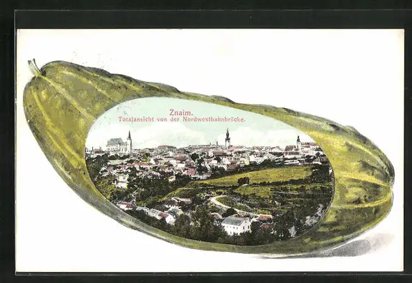 Passepartout-AK Znaim, Totalansicht von der Nordwestbahnbrücke in Gurke