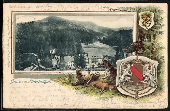 Passepartout-Lithographie Allerheiligen, Ortsansicht aus der Vogelschau, Wappen