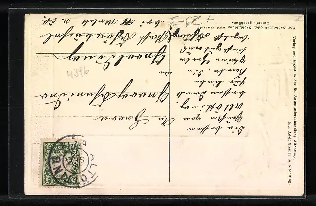 Personenbezogene Daten auf der Rückseite der Karte wurden durch blauen Textmarker unkenntlich gemacht. Die blauen Stellen sind auf die Vorderseite durchgeweicht und wirken sich negativ auf das Postkartenfoto aus
