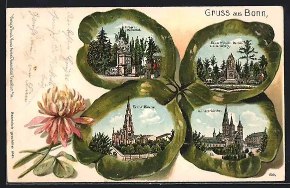 Passepartout-Lithographie Bonn, Krieger-Denkmal, Münsterkirche, Kaiser Wilhelm Denkmal a. d. Venusberg, Kleeblatt