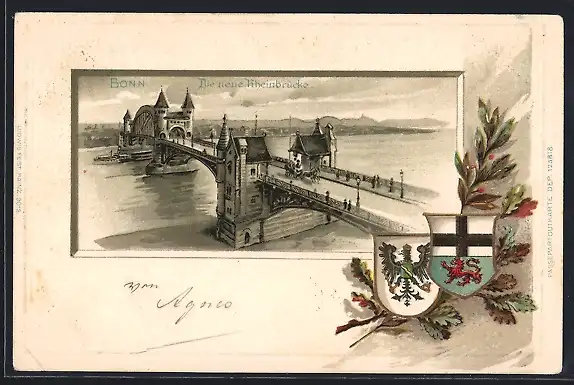 Passepartout-Lithographie Bonn, Neue Rheinbrücke mit Wappen