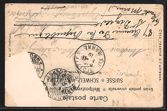 gelaufen 1910, Briefmarke entfernt, rückseitig Oberflächenschaden, Eckknicke links u. rechts, Bugspur re. oben