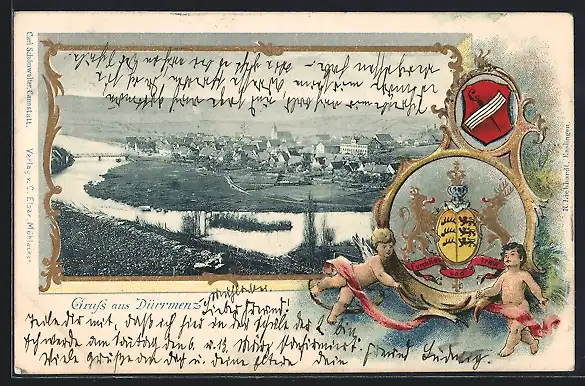 Passepartout-Lithographie Dürrmenz, Teilansicht mit Kirche, Wappen