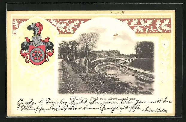 Passepartout-Lithographie Erfurt, Blick vom Louisenpark aus, Wappen