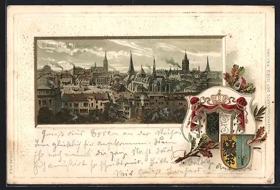 Passepartout-Lithographie Essen / Ruhr, Totalansicht, Wappen