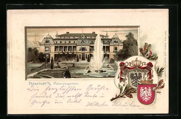 Passepartout-Lithographie Frankfurt-Westend, Palmengarten, Wappen und Eichenzweig